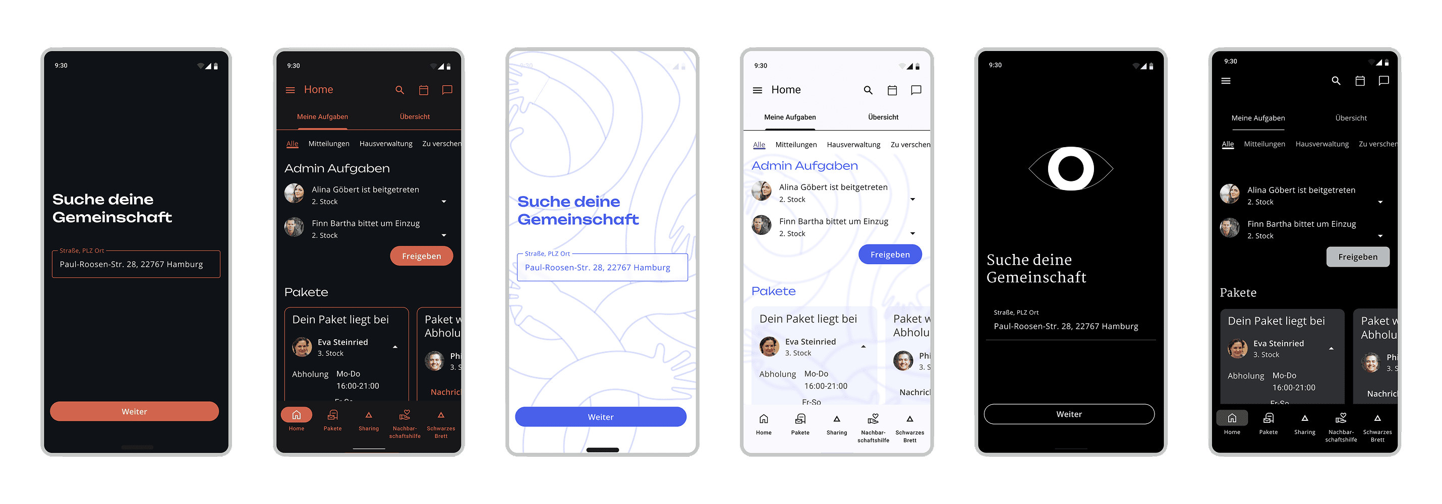Anhand meiner Moodboards entwickelte ich drei Designvarianten und Farbschemata, wobei die Anordnung der Elemente auf den Screens nahezu abgeschlossen war. Auch diese unterschiedlichen Darstellungsvarianten testete ich mithilfe meiner Probanden.